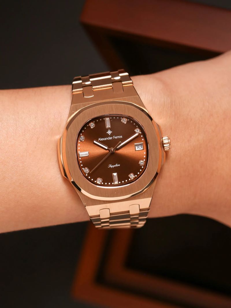 Alexander Ferros 6152R gây ấn tượng với thiết kế sang trọng, vỏ và dây đeo thép không gỉ mạ vàng hồng cao cấp. Mặt số tối giản nhưng tinh tế cùng bộ máy Nhật Bản bền bỉ, chính xác giúp sản phẩm trở thành lựa chọn lý tưởng cho những ai yêu thích sự đẳng cấp và hiện đại.