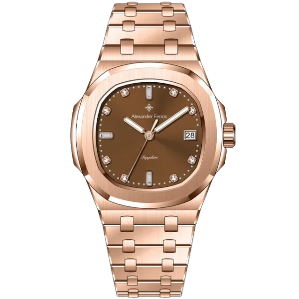 Alexander Ferros 6152R gây ấn tượng với thiết kế sang trọng, vỏ và dây đeo thép không gỉ mạ vàng hồng cao cấp. Mặt số tối giản nhưng tinh tế cùng bộ máy Nhật Bản bền bỉ, chính xác giúp sản phẩm trở thành lựa chọn lý tưởng cho những ai yêu thích sự đẳng cấp và hiện đại.