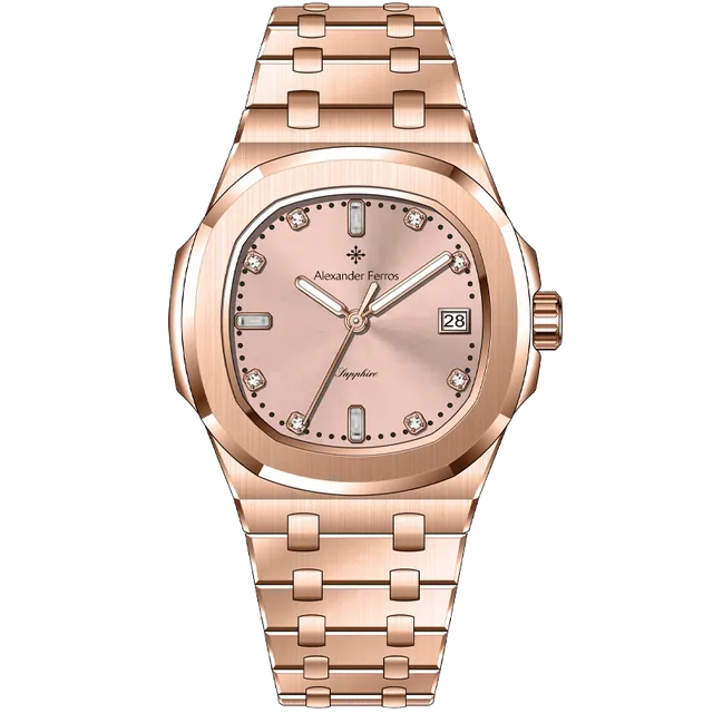 Alexander Ferros 6152R là mẫu đồng hồ nữ mang đậm nét sang trọng, tinh tế dành cho người yêu phong cách hiện đại. Với thiết kế vỏ và dây đeo bằng thép không gỉ mạ vàng hồng cao cấp, sản phẩm toát lên vẻ thanh lịch, dễ dàng kết hợp với nhiều phong cách trang phục.