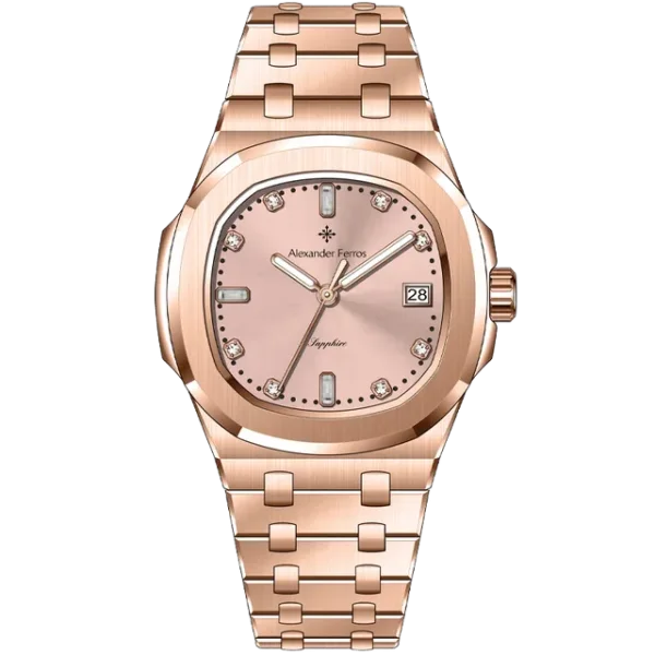 Alexander Ferros 6152R gây ấn tượng với thiết kế sang trọng, vỏ và dây đeo thép không gỉ mạ vàng hồng cao cấp. Mặt số tối giản nhưng tinh tế cùng bộ máy Nhật Bản bền bỉ, chính xác giúp sản phẩm trở thành lựa chọn lý tưởng cho những ai yêu thích sự đẳng cấp và hiện đại.