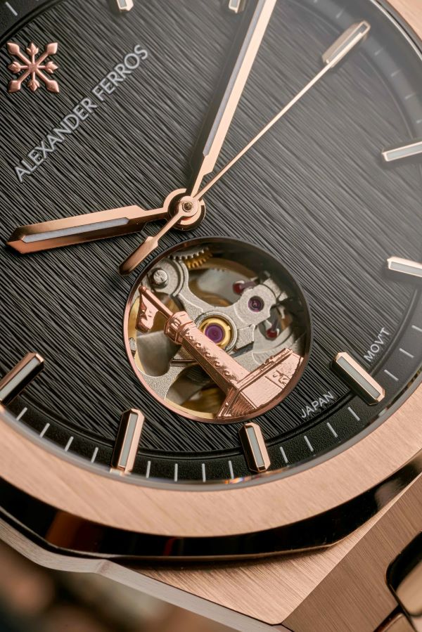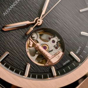 Alexander Ferros 9292R/01 là mẫu đồng hồ nam nổi bật với phong cách thể thao lịch lãm và thiết kế hiện đại. Mặt số với nhiều phiên bản màu được trang trí bằng họa tiết vân gỗ độc đáo, kết hợp cùng bộ kim và cọc số dạng vạch phủ dạ quang, giúp dễ dàng quan sát giờ trong điều kiện thiếu sáng. Điểm đặc biệt của mẫu này là thiết kế Open heart góc 7h kết hợp với hình ảnh Cột cờ Dinh Độc Lập mang bản sắc riêng.