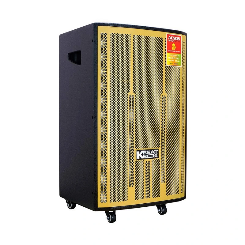 Mặt trước của loa được trang bị một tấm ê căng màu vàng được gắn logo mang tên KBEATBOX rất nổi bật vừa nhấn điểm thiết kế vừa làm tăng độ nhận diện cho thương hiệu. Bên hông của loa là hệ thống núm điều chỉnh tăng giảm âm lượng, cổng kết nối, đường ra vào các tín hiệu cho quá trình phối ghép.