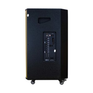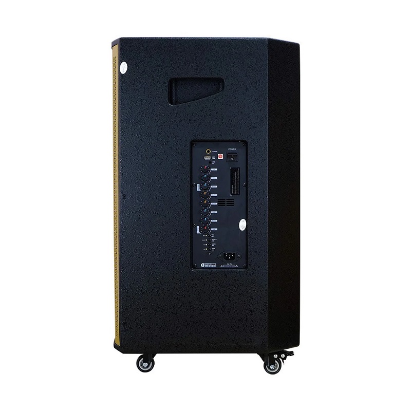 - Chất liệu thùng loa: Thùng gỗ sơn gai – bánh xe, màu đen – lưới vàng