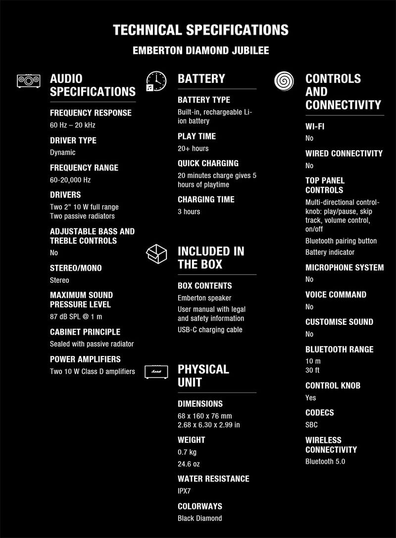 Thông số kỹ thuật của loa Bluetooth Marshall Emberton Diamond Jubilee.