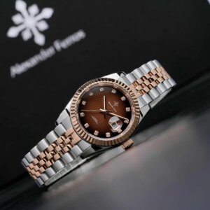 Đồng hồ Nữ Alexander Ferros 8201D/08 31mm demi vàng hồng đính đá mặt số màu nâu Automatic